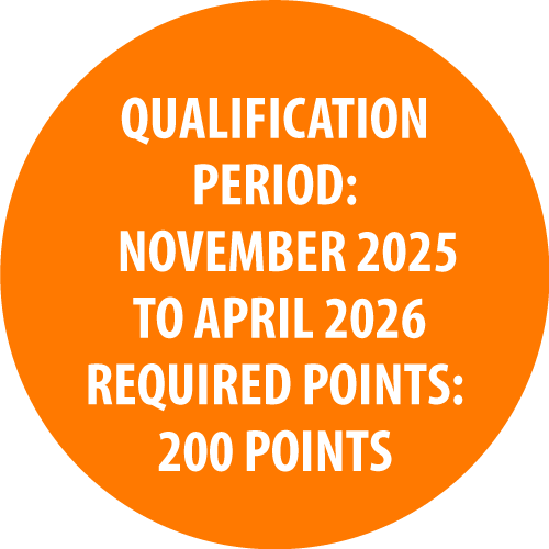 • Must earn 200 total points during the qualification period.
